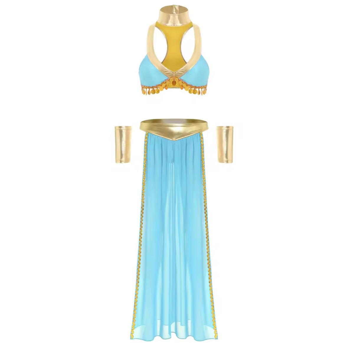 Turn heads in our Golden Goddess Costume Set, a mesmerizing mix of metallic gold and aqua blue. This glamorous two-piece outfit features a shimmering gold halter top, matching waistband, and a flowing sheer blue skirt with side slits for a flirty, elegant look. Complete with gold cuffs and a statement choker, this set captures the essence of luxury and allure.