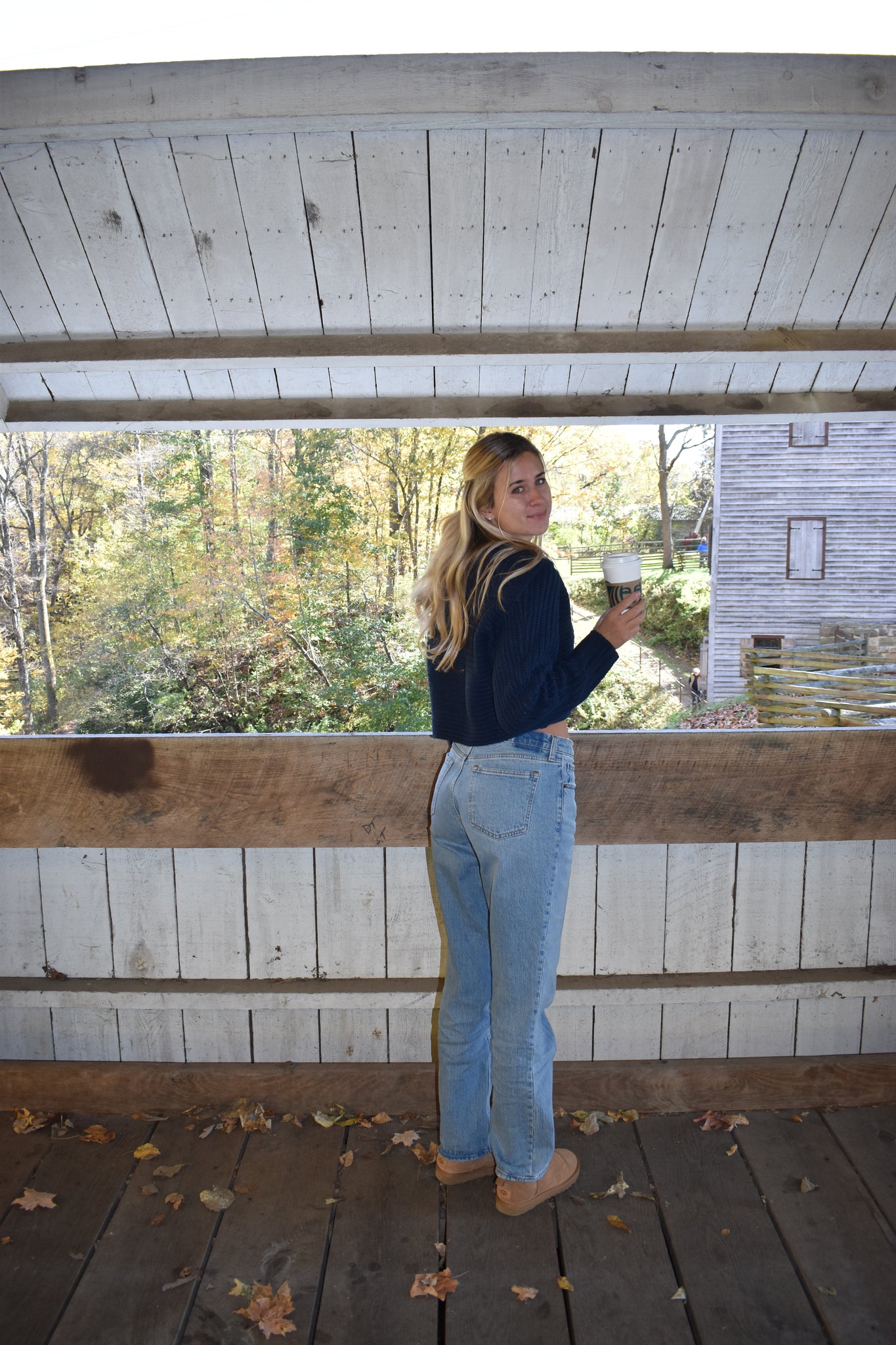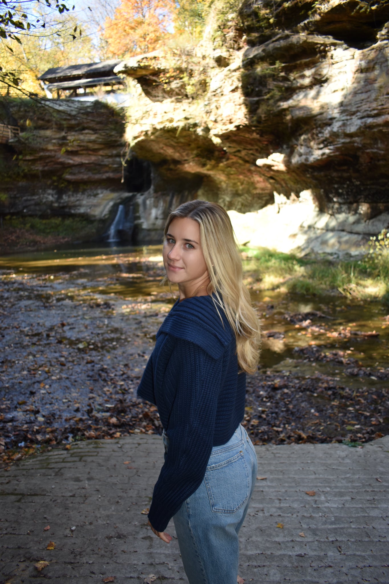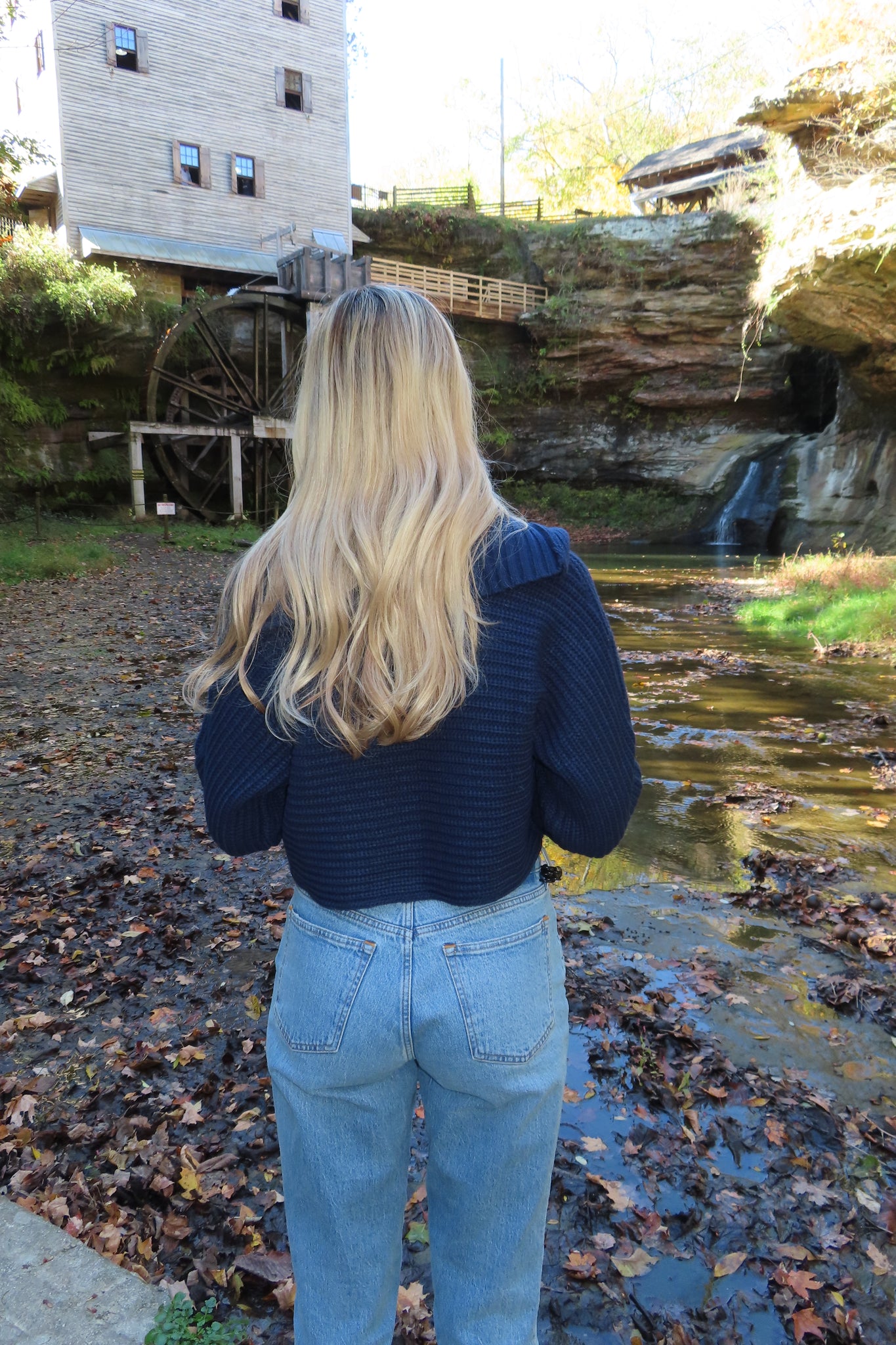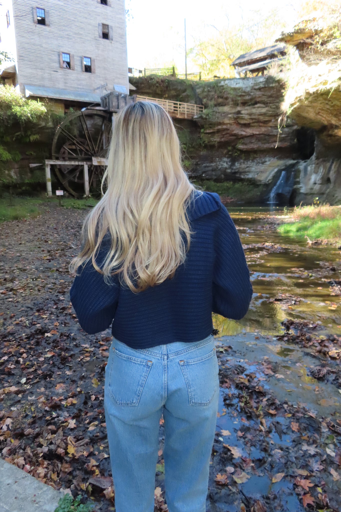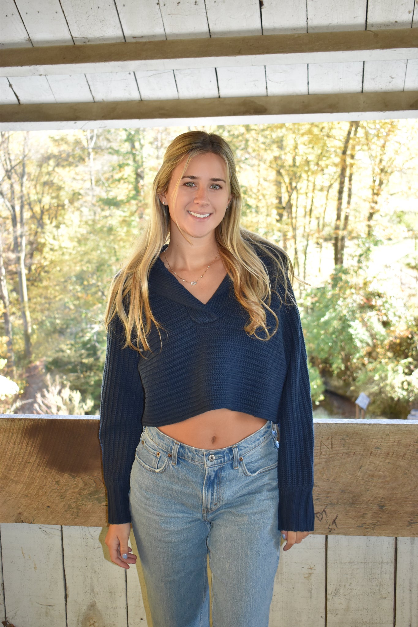 Women’s Cropped Navy Knit Sweater – Collared V-Neck Pullover