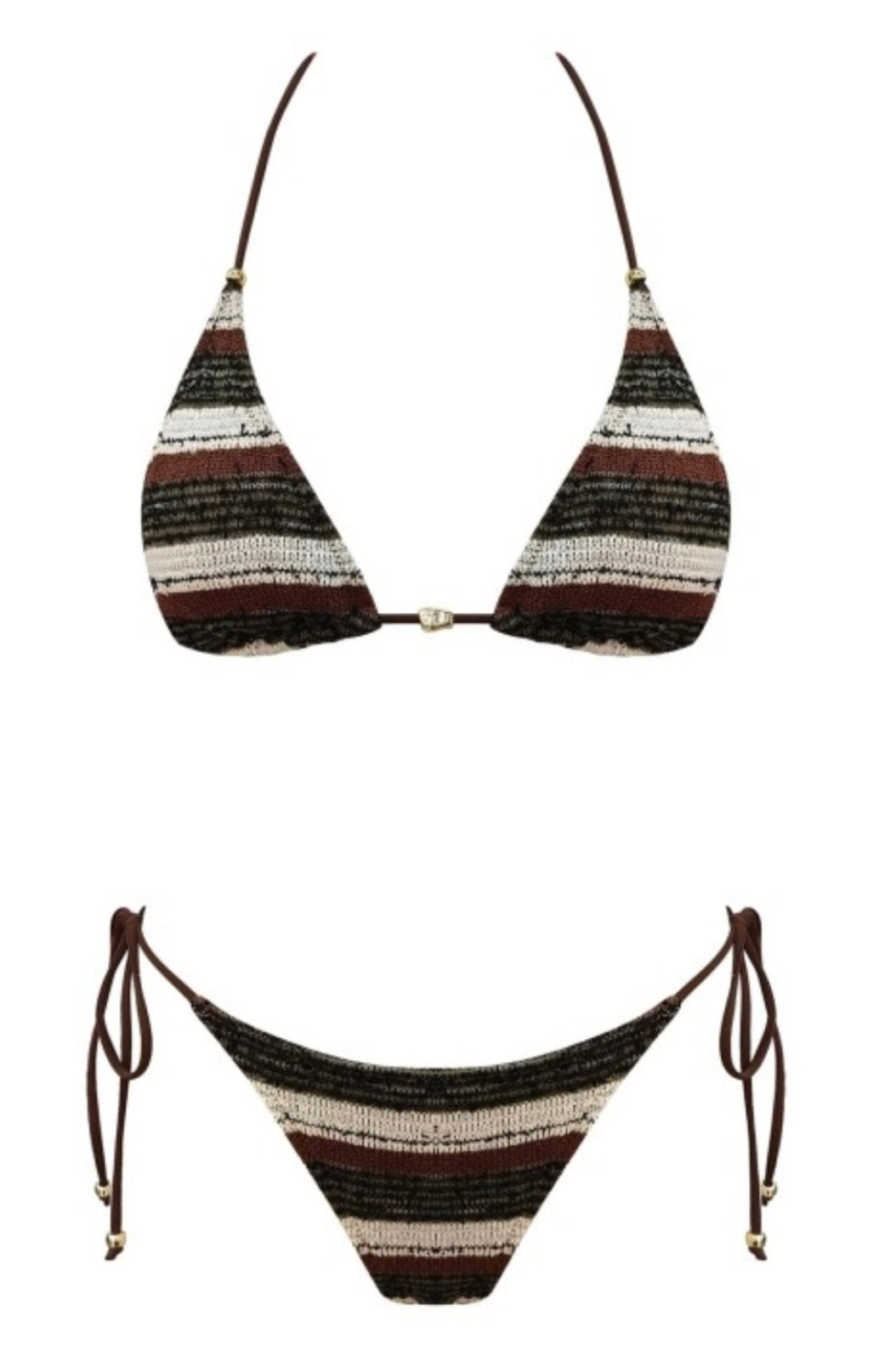 The Saddleback Stripe Bikini Set brings a warm, earthy twist to classic swimwear. Featuring a textured striped knit design in rich saddle brown, cream, and deep olive tones, this triangle bikini captures effortless boho beach style with a flattering, minimal silhouette.